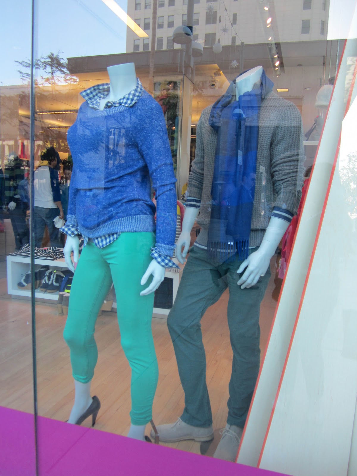 Gap has the jeans and straight up neon colors going on. Pink and blue sweaters and scarves. Let’s not forget the aqua leggings on the mannequin on the bottom.