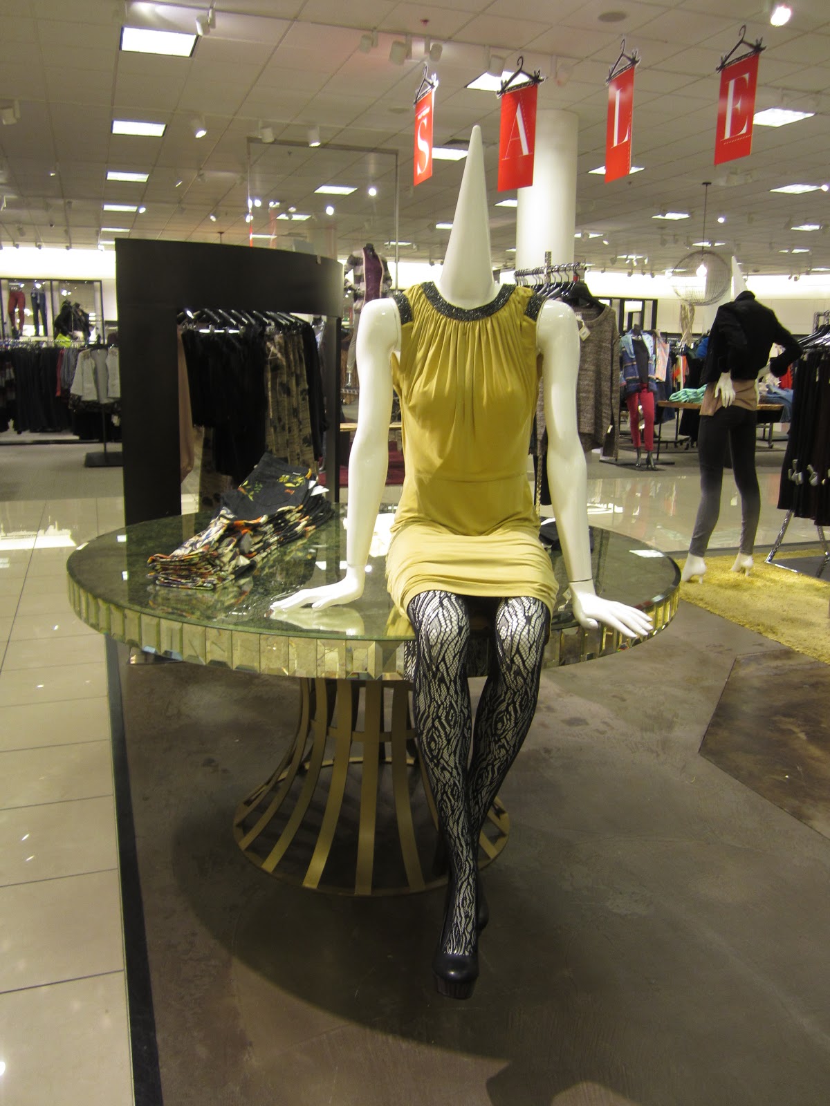 The worst pictures had to happen at my fav shop H & M. I enjoyed their window display… but whats up with the wigs on the mannequins. Who is this chick they seem to be parading around??? Don’t know, don’t care, the end. Let’s focus on the clothes shall. Let’s…. knitted sweater dresses are in, leggings in, creepy long hair wigs not in.